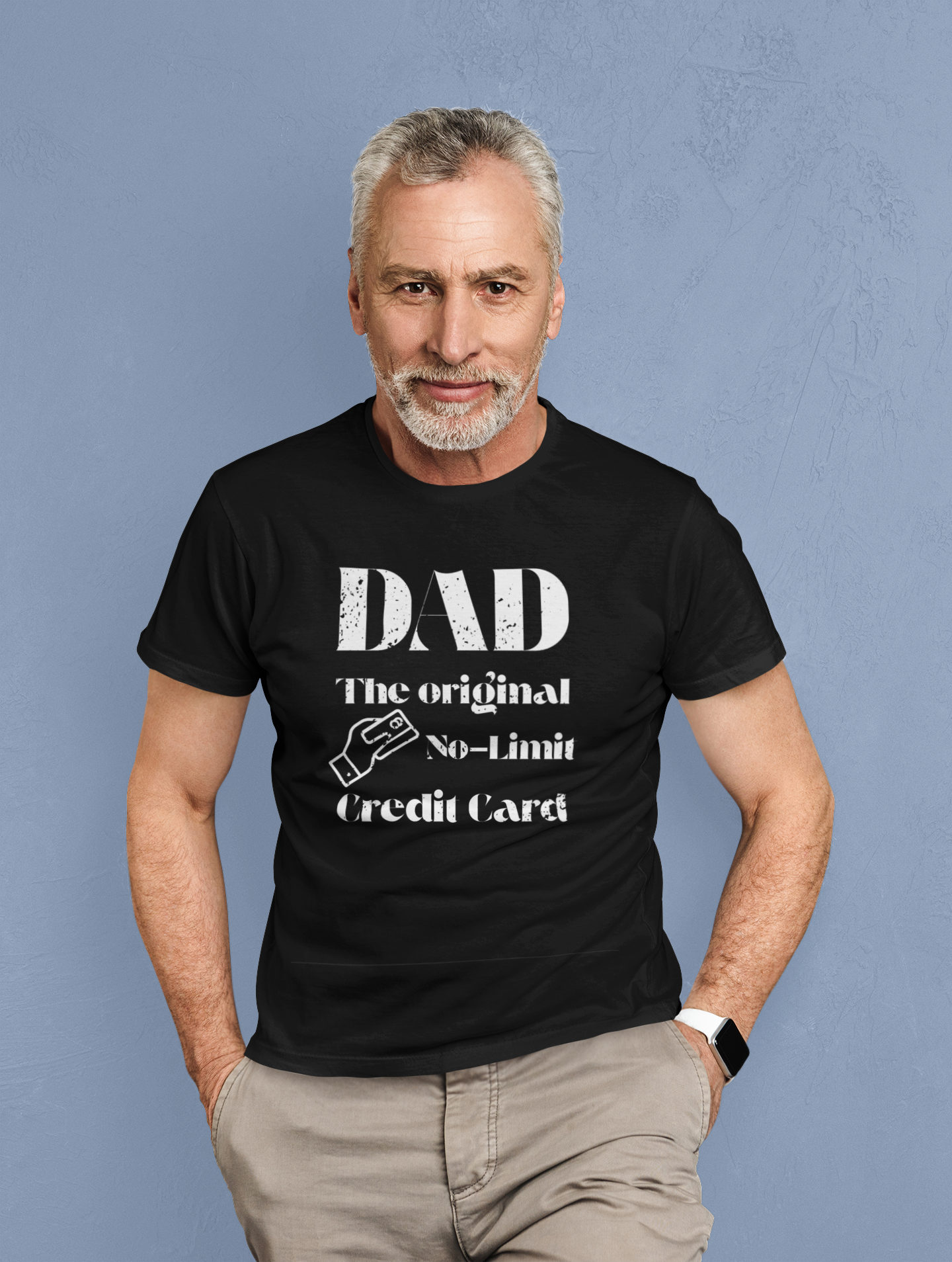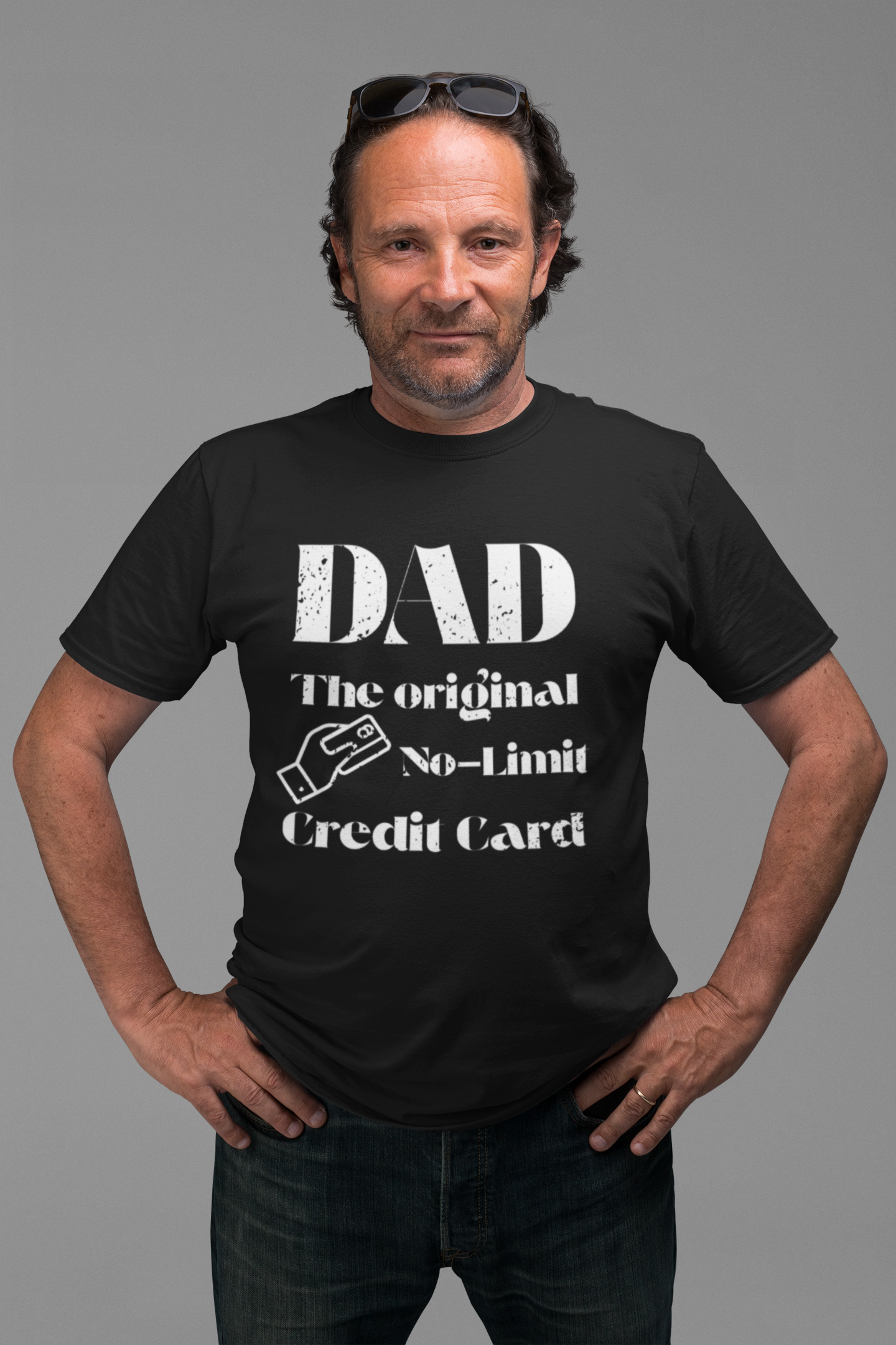 “Dad – The Original No-Limit Credit Card” with a fun graphic of a hand holding a credit card. It’s the perfect blend of humor and style, making it a must-have for dads who love a good laugh.