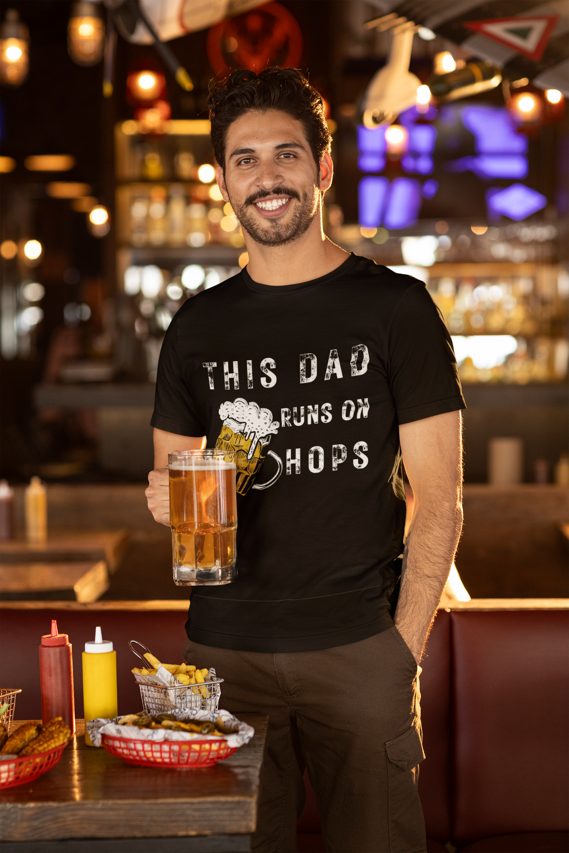 Fuel dad’s sense of humor with a tee that speaks his language – hops! Perfect for beer lovers and proud fathers, this black t-shirt features a bold distressed print that reads “This Dad Runs on Hops” alongside a frothy beer mug graphic. Whether it’s for Father’s Day, birthdays, or just because, this shirt is a guaranteed conversation starter at the brewery, backyard BBQ, or family gathering.