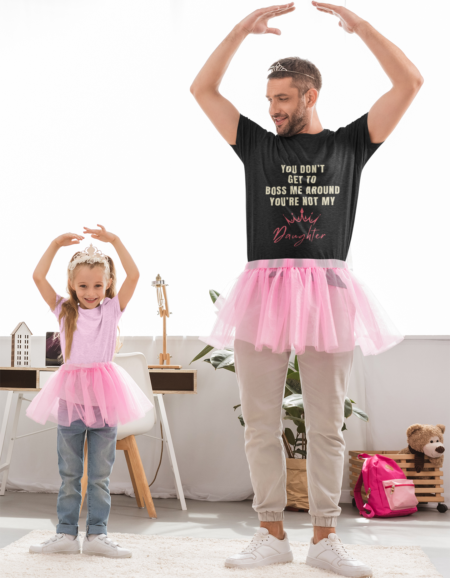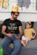 Bring humor home with this playful tee that celebrates the unique (and often hilarious) bond between parents and daughters. Featuring the bold phrase “You don’t get to boss me around – you’re not my daughter” alongside a stylish crown graphic, this shirt is perfect for dads and moms who know that in the family hierarchy, daughters often hold the real power.